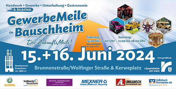 GEWERBEVEREIN RÜSSELSHEIM Am 15. & 16. Juni 2024 findet die Gewerbe- & Zukunftsmeile in Bauschheim statt. Ausrichter wird der Gewerbeverein Rüsselsheim 1888 e.V. sein. Schirmherr ist Oberbürgermeister Patrick Burghardt. Neben der Präsentation & Ausstellung einzelner Gewerbetreibender soll es für unsere Besucher ein attraktives, vielseitiges Angebot geben, welches sich mit gastronomischen Köstlichkeiten auf einer Food Meile und einem abwechslungsreichen, interaktiven Rahmenprogramm präsentiert. Die Gewerbe- & Zukunftsmeile wird samstags von 14:00 bis 20:00 Uhr sowie sonntags von 11:00 bis 18:00 Uhr geöffnet sein.