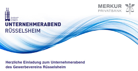 GEWERBEVEREIN RÜSSELSHEIM Herzliche Einladung zum Unternehmerabend des Gewerbevereins Rüsselsheim. Mittwoch, 26. Juni 2024 18:00 bis 21:30 Uhr, Restaurant Wellenlänge, Mainstraße 17, 65428 Rüsselsheim am Main. Das Programm des Abends: